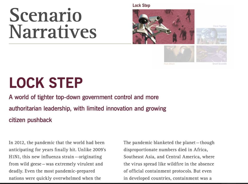 A proposito di questa Dittatura Pandemica, esiste pure un interessante documento della Fondazione Rockefeller del 2010. È citato in un libro edito dalla Banca Mondiale da due noti ricercatori ed economisti della World Bank che citano gli scenari possibili futuri. Quando ho letto, mi sono detta “No, Non può essere vero !”. Ma poi ho verificato che il documento è firmato da Peter Schwartz, collaboratore del Forum, e allora mi sono dovuta convincere che non era frutto della mia immaginazione. Vi leggo solo qualche frase.
